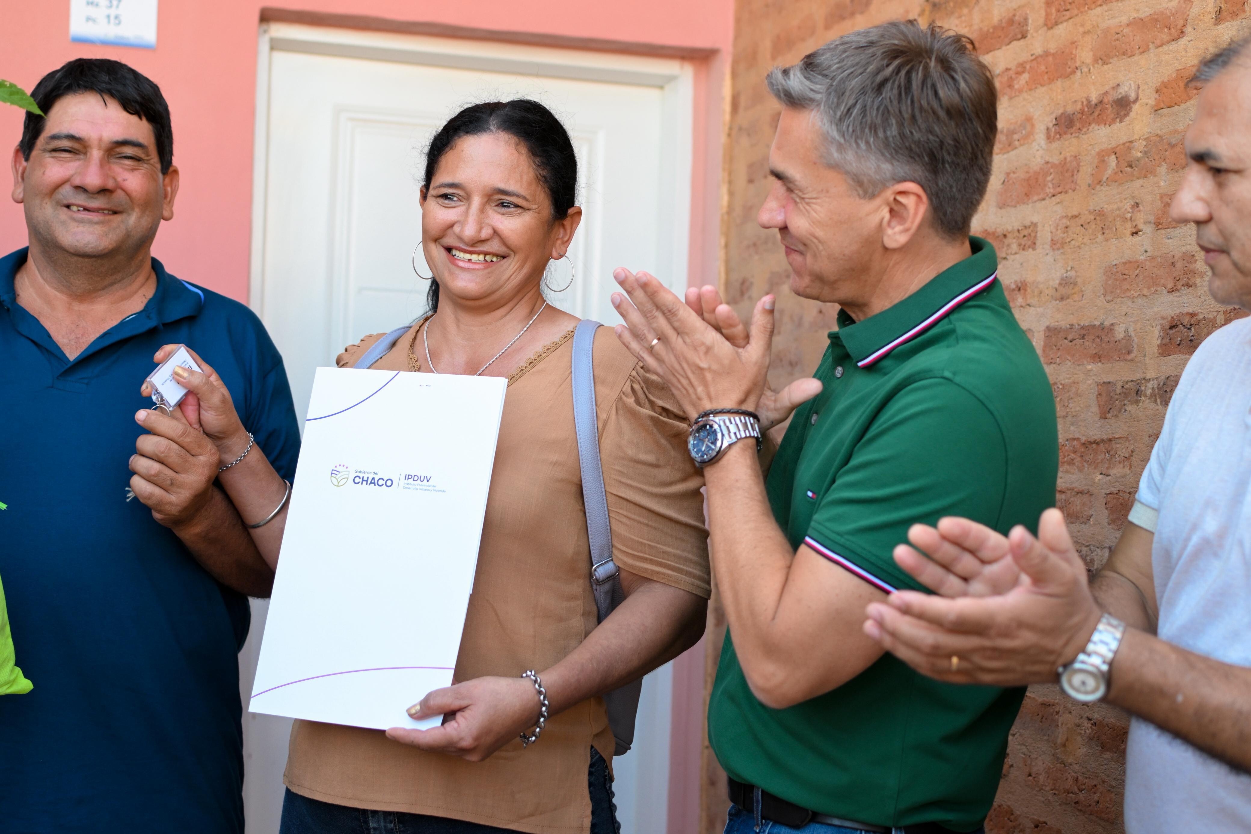 Este sábado, el gobernador Leandro Zdero encabezó la entrega de 32 viviendas en la localidad de Quitilipi, un acto que marcó un avance concreto en el acceso a la casa propia para familias chaqueñas que aguardaron durante muchos años una respuesta habitacional. La actividad contó con la presencia del presidente del Instituto Provincial de Desarrollo Urbano y de Vivienda (IPDUV), Fernando Berecoechea; el intendente local, Ariel Lovey, autoridades provinciales y municipales.
