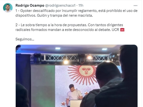 “Lo de Gyöker en el debate fue un papelón, le sobró tiempo porque no tienen propuestas. Además debería ser descalificado por incumplir reglamento, ya que está prohibido el uso de dispositivos. Guión y trampa del nene macrista”, apuntó Ocampo.